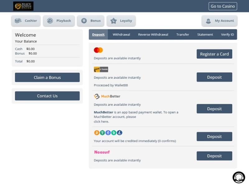 O sistema bancário do Black Lotus Casino é bastante eficiente, oferecendo depósitos e saques por cheque, cartão de crédito, carteira eletrônica e Bitcoin. O site exige um prazo de processamento de 48 horas para ganhos, mas os pagamentos via carteira eletrônica e Bitcoin são instantâneos após esse período. Outros métodos de pagamento podem levar mais tempo, mas isso se deve mais a uma limitação dos próprios métodos do que do cassino em si. Vale ressaltar que o cassino tem um limite de saque de US$ 1.500, sendo que valores maiores serão divididos.