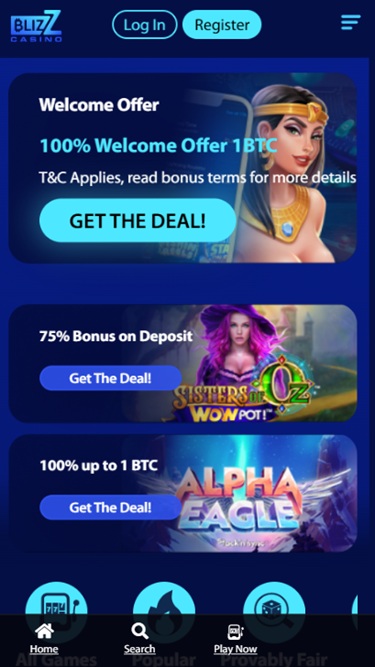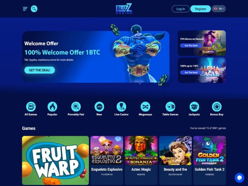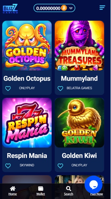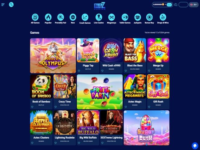 A vasta biblioteca de jogos está organizada em seções de Cassino e Cassino ao Vivo , e também há Corridas e Promoções para animar a experiência dos jogadores no Blizz Casino.