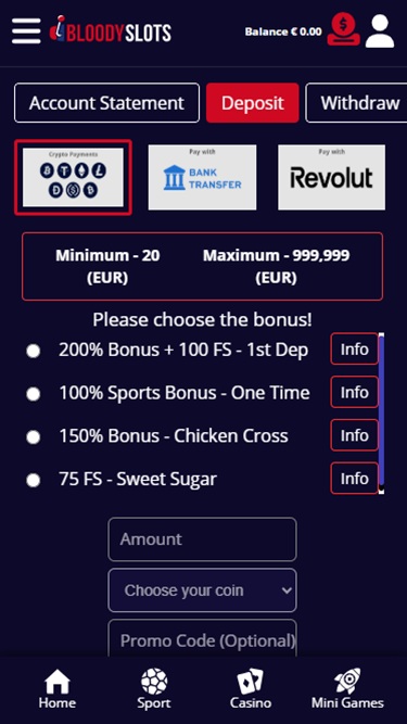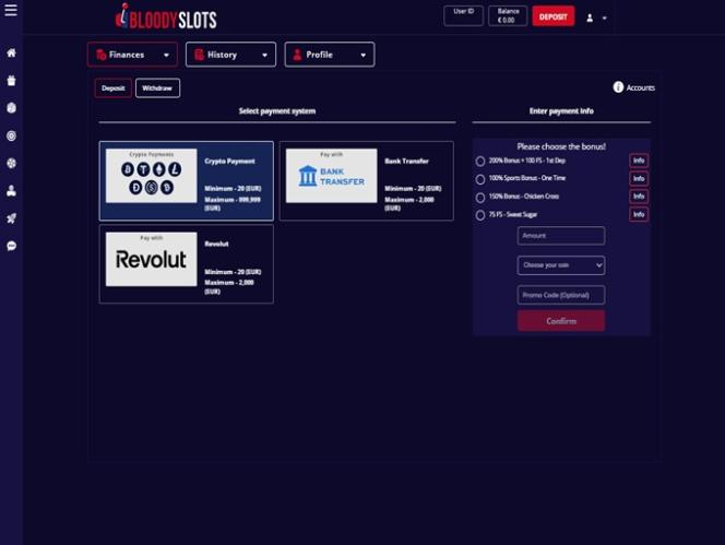 No Bloody Slots, os jogadores terão a opção de usar vários métodos de pagamento para depositar e sacar fundos de suas contas de cassino, sendo algumas das opções populares Visa , Mastercard, Apple Pay, Google Pay , Monzo , Transferência Bancária e Revolut. A marca também aceita várias criptomoedas, incluindo Bitcoin, Bitcoin Cash , Ethereum, Litecoin,USD Coin e Tether .