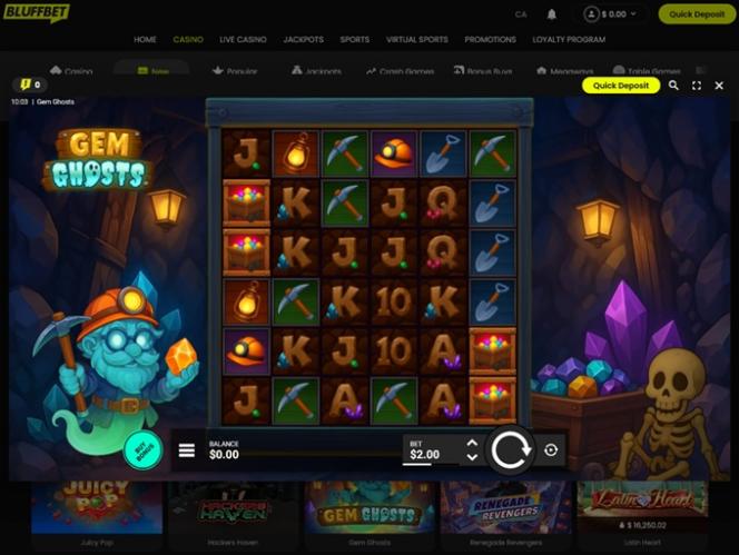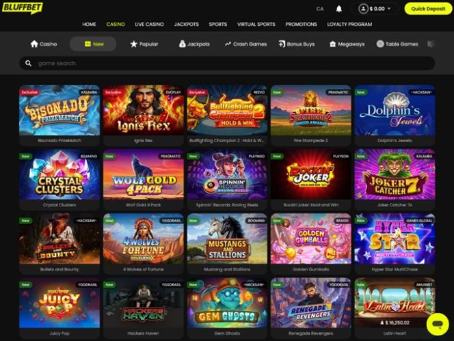Em relação a tipos e categorias de jogos específicos, os caça-níqueis com dinheiro real ocupam o primeiro lugar como a escolha mais popular entre os jogadores do Bluffbet. Isso não é surpresa, já que o cassino conseguiu reunir uma seleção impressionante desses jogos. Você poderá jogar praticamente todas as categorias e gêneros que imaginar, incluindo jogos com bônus, lançamentos recentes, caça-níqueis clássicos, Megaways, Hold'em e Cluster Pays.