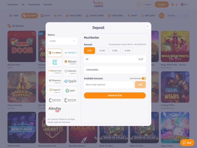 A seção de promoções da BOHO oferece bônus bastante atraentes. Os membros recém-registrados podem contar com um generoso pacote de boas-vindas que inclui bônus para os três primeiros depósitos.
