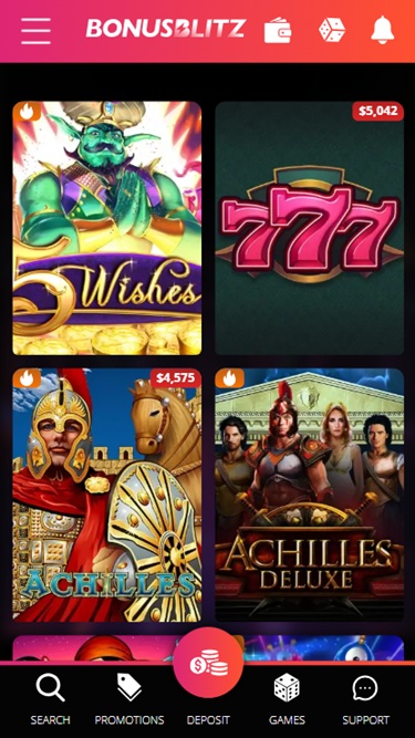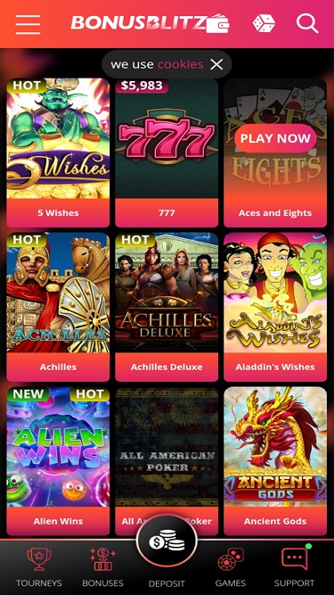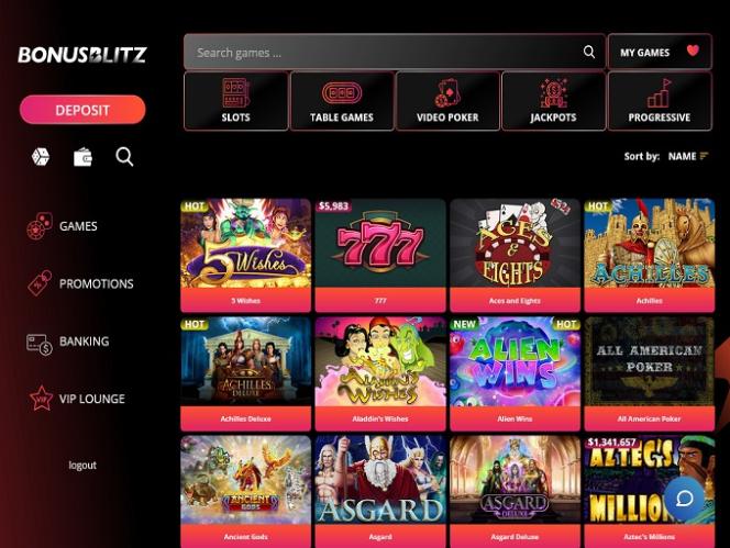 No Bonus Blitz Casino, você encontrará uma boa variedade de caça-níqueis online, desenvolvidos principalmente pela Realtime Gaming. Alguns dos jogos mais populares deste cassino são 5 Wishes, Achilles Asgard Deluxe, Cleopatra's Gold, Fortunes of Olympus e Henhouse.