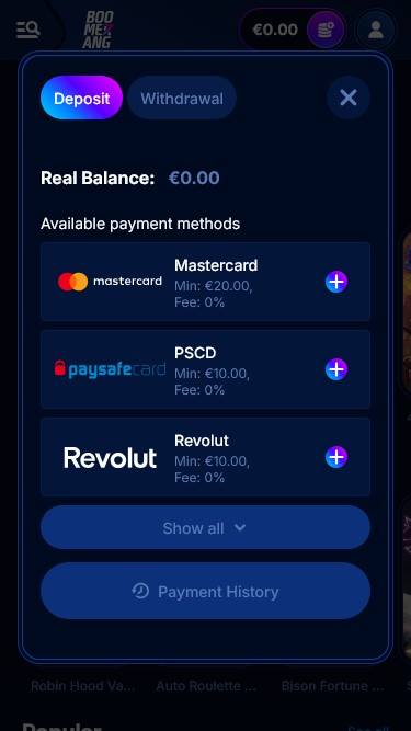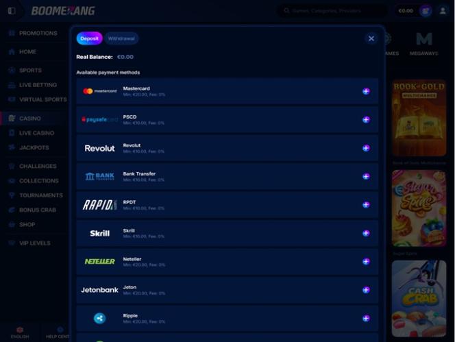 Quando se trata de métodos de pagamento, o Boomerang Bet também não decepciona, oferecendo uma infinidade de opções diferentes. Além das opções mais comuns, como carteiras eletrônicas e cartões bancários, você também pode usar diversas criptomoedas, como Bitcoin, Dogecoin, USDT e muitas outras!