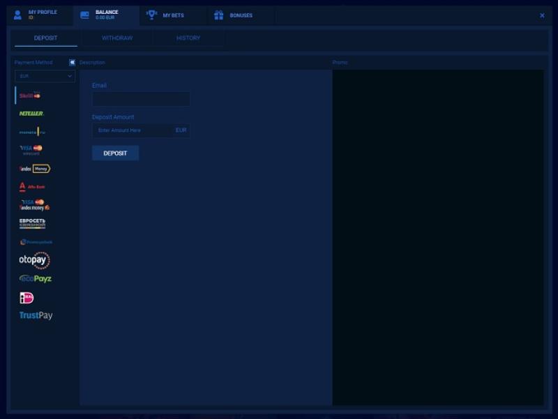 Existem muitos métodos de depósito e saque. Existe até o Webmoney. Os provedores são os melhores. Bônus de inscrição de 100% (lembre-se de que as condições são uma aposta de 35x, para bônus + depósito). Depósito mínimo e saque de apenas 1 euro! Eu gosto!