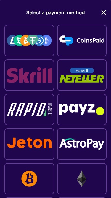 O sistema de pagamento oferece uma ótima variedade de opções. Lembre-se de que os métodos disponíveis variam de acordo com o país, mas há opções suficientes para todos, independentemente da jurisdição em que o jogo é realizado.