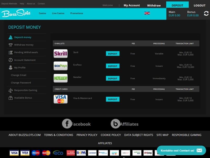 IncrívelO bom e velho Buzzslots é um cassino muito legal. Não tivemos problemas até agora, eles usam todos os métodos de depósito e também são rápidos com os saques. O melhor é que eles costumam dar giros grátis, ou você pode ganhar giros grátis na página deles no Facebook se participar ;=).