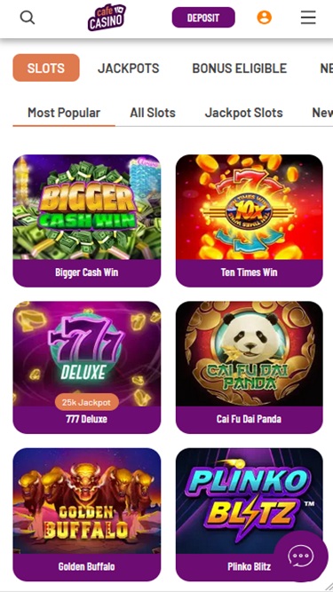O Café Casino oferece uma grande variedade de caça-níqueis em vídeo, com jogos da RTG e da TopGame em seu catálogo. Há alguns jackpots progressivos disponíveis, com grandes prêmios em dinheiro para os jogadores que tiverem sorte. Os caça-níqueis clássicos parecem ser um pouco secundários, mas ainda assim é possível encontrar ótimos jogos para jogar.