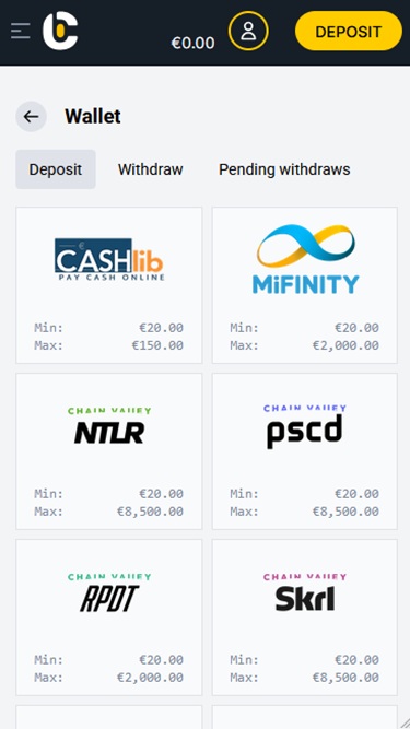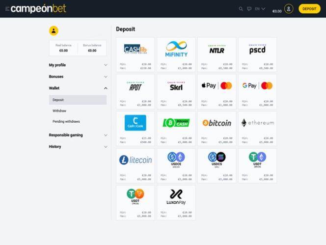 O sistema bancário do CampeonBet é bastante eficiente, pois o cassino aceita depósitos e saques via Jeton, Visa, ecoPayz, MasterCard, Sofort, Multibanco, Skrill e Neteller. O cassino processa todos os pagamentos em até 12 horas e não há taxas associadas às opções bancárias.