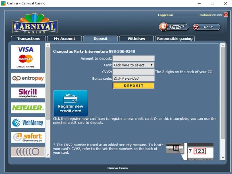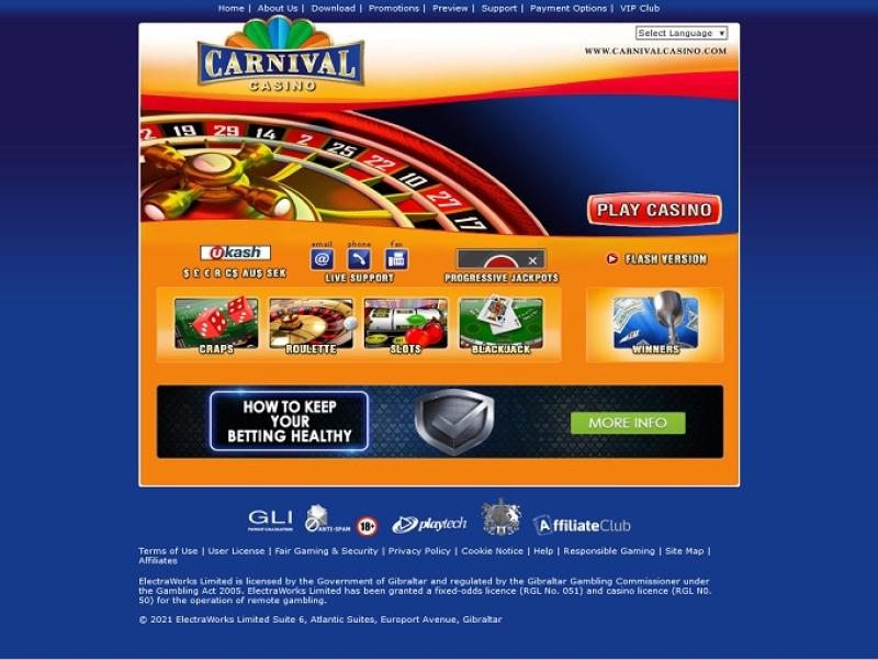 O Carnival Casino é ideal para fãs da Playtech, fornecedora de caça-níqueis. Não há versão em Flash, apenas versão para download. Há diversos métodos de depósito e saque, mas lembre-se de que o prazo de pagamento para todos os cassinos Playtech é longo.
