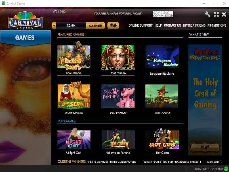 Carnival Casino - com um visual bem antigo. Este pode ter sido um dos moicanos, que permanece inalterado há séculos. Bem, na verdade, este é um cassino da Playtech e parece uma "velhinha", mas há algumas coisas boas nele. Primeiro, jogos excelentes.