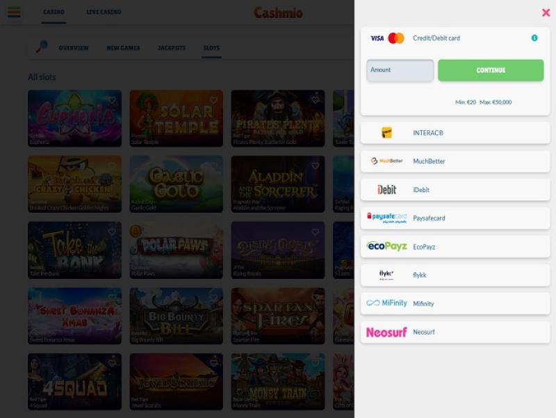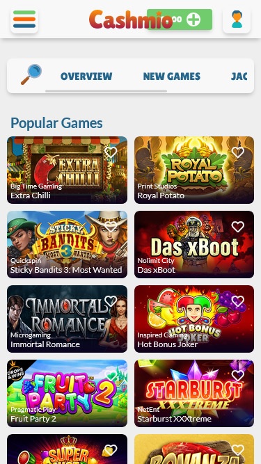 O Cashmio Casino é operado pela Microgaming, Net Entertainment, 1x2gaming, Barcrest, Big Time Gaming, ELK Studios, Evolution Gaming, iSoftBet, lightningboxgames, Play'n GO, Quickspin, Rabcat, Relax Gaming, Thunderkick, Yggdrasil, Endorphina, Pragmatic Play, Nolimit City, Red Tiger Gaming, IGT, SpinPlay Games, Games Global, 2by2 Gaming, Aristocrat, Bally Technologies, Blueprint Gaming, Leander Games, NextGen, NYX Interactive, Push Gaming, WMS, Spigo, Scientific Games, Side City Studios, Authentic Gaming, Foxium, Betdigital, Just For The Win, Slingshot Studios, Crazy Tooth Studio and ReelPlay e seus jogos são oferecidos por meio de uma plataforma de jogo instantâneo baseada na web, que permite que você se registre, jogue e deposite, tudo pelo seu navegador de internet. Jogos para dispositivos móveis também estão disponíveis, permitindo que você jogue uma grande variedade de jogos pelo seu smartphone ou tablet.