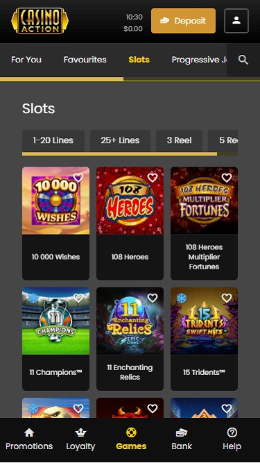 Os caça-níqueis são, de longe, a maior oferta do Casino Action, com centenas de títulos, incluindo diversos jogos de marcas famosas com propriedades de filmes que você reconhecerá instantaneamente. O cassino também oferece vários jackpots progressivos, permitindo que os jogadores testem a sorte e tentem ganhar prêmios em dinheiro que variam de algumas centenas a mais de um milhão de dólares.
