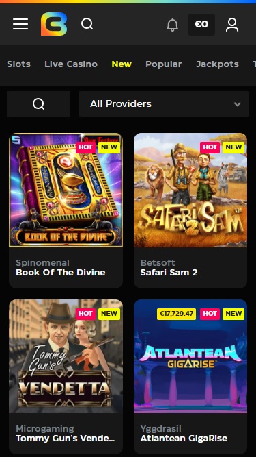 Os fornecedores incluem Microgaming, Net Entertainment, Playtech, BetSoft, 1x2gaming, Amatic Industries, Big Time Gaming, ELK Studios, Evolution Gaming, EYECON, Genesis Gaming, iSoftBet, lightningboxgames, Novomatic, Play'n GO, Quickspin, Relax Gaming, Thunderkick, Yggdrasil, Endorphina, Wazdan, Realistic Games, Booming Games, Pragmatic Play, Nolimit City, GAMING1, Red Tiger Gaming, Spinomenal, Red Rake Gaming, Skillzzgaming, Fantasma Games, Triple Edge Studios, BGAMING, Northern Lights Gaming, Stormcraft Studios, Switch Studios, Electric Elephant Games, Pocket Games Soft, Dreamtech Gaming, All41 Studios, Gameburger Studios, Pulse 8 Studios, Neon Valley Studios, Swintt, TrueLab Games, SpinPlay Games, Real Dealer Studios, GONG Gaming, Buck Stakes Entertainment, Games Global, Amusnet Interactive, 2by2 Gaming, Ainsworth, Greentube, Push Gaming, Tom Horn Gaming, Gamomat, Authentic Gaming, Iron Dog Studio, Foxium, Just For The Win, Reflex Gaming, Storm Gaming Technology, Wild Streak Gaming, Golden Hero, Fortune Factory Studios, Jade Rabbit Gaming, 4ThePlayer, AvatarUX, Crazy Tooth Studio, ReelPlay, Alchemy Gaming, Rarestone Gaming, Snowborn Games, Hacksaw Gaming, Max Win Gaming, Gold Coin Studios, Bang Bang Games, Half Pixel Studios, Arcadem, SilverBack Gaming, Peter And Sons, Eurostar Studios, Aurum Signature Studios, Armadillo Studios and Apparat Gaming .