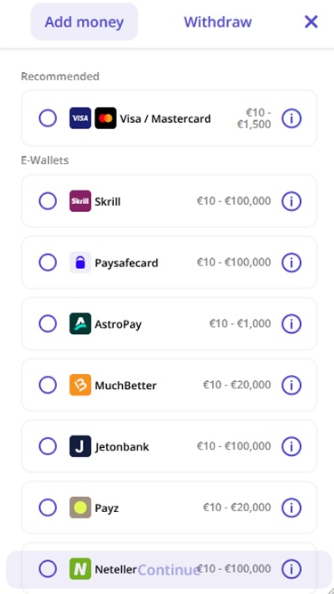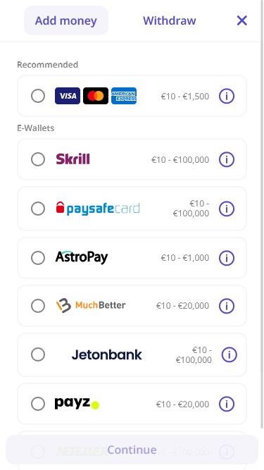 As moedas aceitas incluem Bitcoin , Bitcoin Cash, Ethereum, Litecoin, Ripple, Tether, USD, CAD, EUR, NOK, JPY, INR… Lembre-se que a disponibilidade depende da sua jurisdição de jogos, pois alguns métodos de pagamento podem ser restritos em seu país para jogos de azar online.