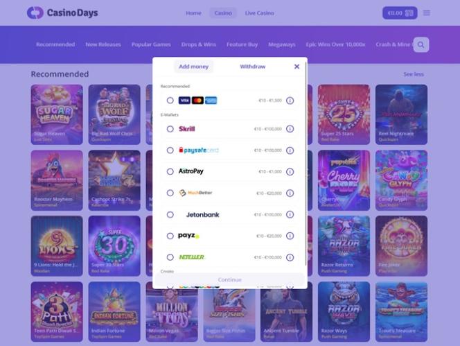 O Casino Days aceita pagamentos tanto em moeda fiduciária quanto em criptomoedas. O caixa oferece uma seleção impressionante de métodos de pagamento, incluindo transferências bancárias, cartões de crédito e débito populares, carteiras eletrônicas e serviços online como Google Pay, Klarna, Skrill e outras opções.