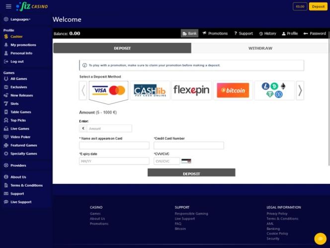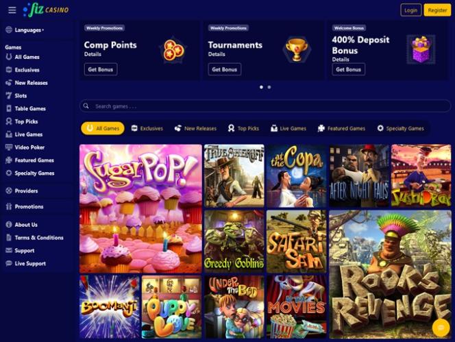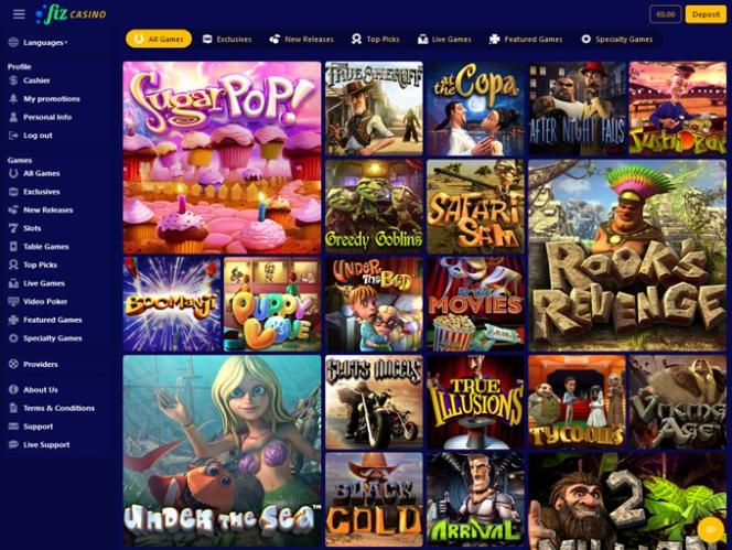 O Casino Fiz é alimentado por BetSoft, Genesis Gaming, Rival, Saucify, Vivo Gaming, Arrows Edge, Radi8 Games, Fresh Deck Studios, Qora Games, Genii, Dragon Gaming and Dragoon Soft e os jogos do casino são disponibilizados através de uma plataforma online. Um casino móvel também está disponível para quem gosta de jogar casino nos seus smartphones e tablets.Outros jogos