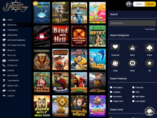 Os caça-níqueis representam uma grande parte da oferta do Casino Grand Bay, com mais de 30 caça-níqueis de vídeo exclusivos disponíveis. Não há muitos caça-níqueis clássicos, mas os jogos em si são únicos e divertidos para jogadores acostumados com títulos de desenvolvedores como a Real Time Gaming.