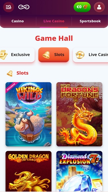 Em primeiro lugar, gostaríamos de destacar o quão fenomenal é o visual do site. O design da plataforma de cassino online combina uma abordagem minimalista com o uso abundante de tons vibrantes de rosa e roxo. É realmente convidativo e visualmente atraente, o que é fundamental para causar uma boa primeira impressão.