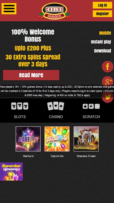 O Casino Magix é um site de apostas online lançado em 2015, pertencente e operado pela Cozygames Management Limited. O cassino é conhecido pelos seus baixos requisitos de apostas em bônus e pelos seus pagamentos rápidos, o que o tornou popular em pouco tempo de atividade.Informações do cassino