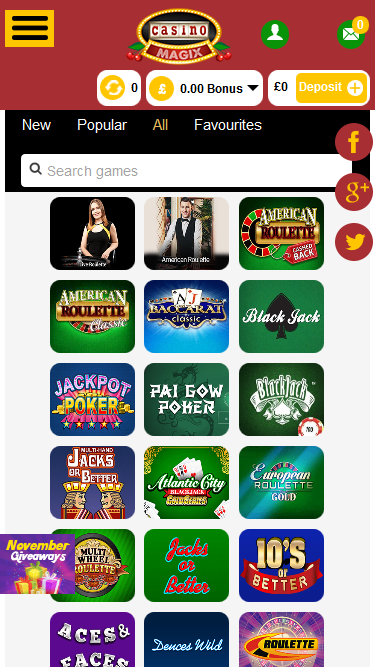 O Casino Magix é alimentado por Microgaming, Net Entertainment, EYECON, Genesis Gaming, Thunderkick, Games Global, Wizard Games, Blueprint Gaming, Cozy Games, NextGen and Pariplay e seus jogos são oferecidos por meio de uma plataforma online. Um site para dispositivos móveis também está disponível para aqueles que preferem jogar em seus smartphones ou tablets.Blackjack