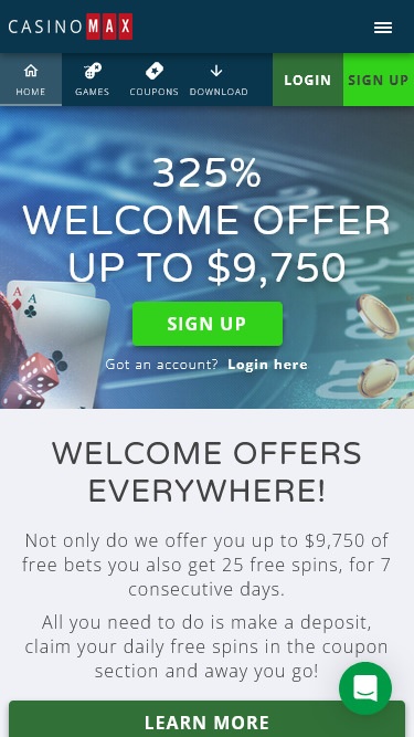 O Casino Max é um site de apostas online lançado em 2017 e administrado pelo novo grupo de apostas Legend Affiliates. O cassino aceita jogadores americanos e utiliza o software RTG, o que pode levar você a pensar que se trata de um site comum. No entanto, não é o caso, pois o site oferece pagamentos rápidos, bons termos de bônus e uma biblioteca de jogos decente.