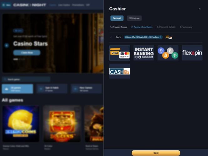 Casino Night aceita diversas moedas digitais, incluindo Cardano, Bitcoin Cash, Bitcoin, Dogecoin, Ethereum, Litecoin, Solana, Tron, USD Coin, Tether, Ripple e várias outras opções de pagamento em criptomoedas .