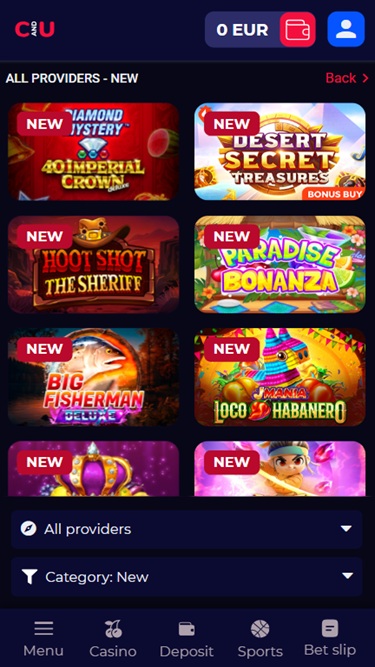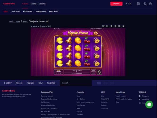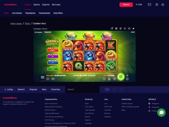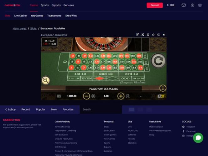 O CasinoAndYou oferece um generoso pacote de boas-vindas para novos jogadores, dividido em vários primeiros depósitos. Os bônus são super fáceis de ativar — basta verificar seu e-mail e telefone, e pronto. E a diversão não para por aí. Há torneios semanais, ofertas de cashback, rodadas grátis e até um programa de fidelidade que recompensa jogadores frequentes. Eles também estão constantemente testando novas mecânicas de recompensa, então, se você gosta de experimentar algo diferente, fique de olho.