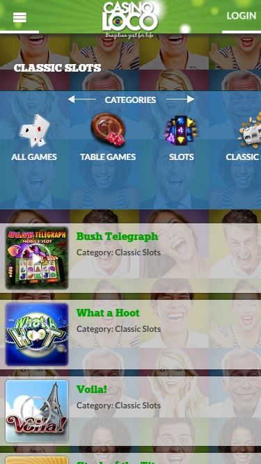 O CasinoLoco é alimentado por Net Entertainment and Ezugi e seus jogos são fornecidos por meio de uma plataforma baseada na web, bem como por meio de um site móvel que permite jogar em smartphones e tablets.Outros jogos