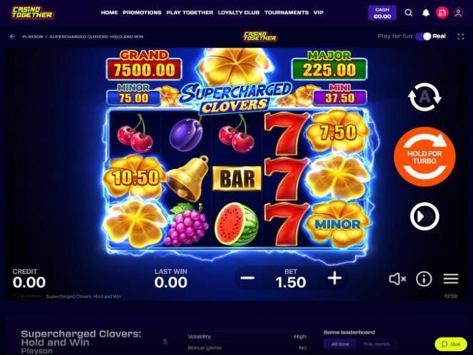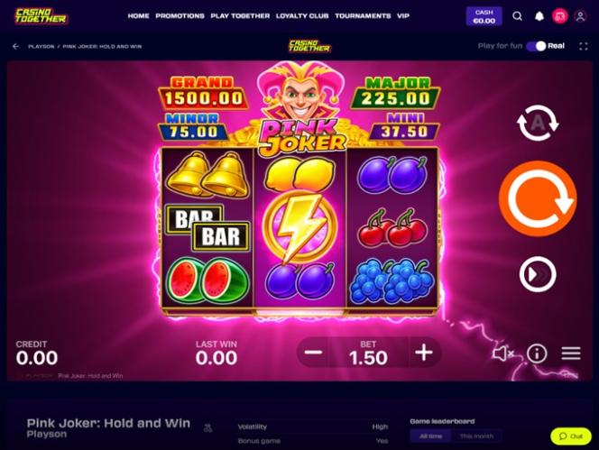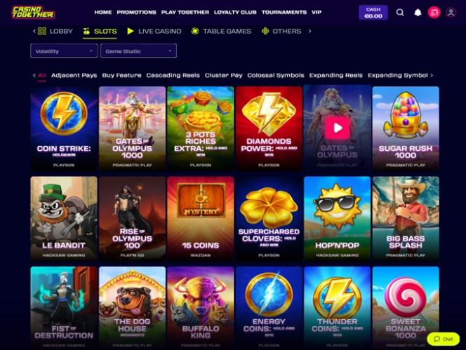 A CasinoTogether colabora com alguns dos desenvolvedores de software mais conceituados do mercado e oferece uma vasta biblioteca de jogos bem organizada em categorias atraentes: Caça-níqueis, Jogos de Mesa, Jogos ao Vivo, Bingo, Jogos de Azar, Jogos Instantâneos, Raspadinhas, Show 3D, Esportes Virtuais...