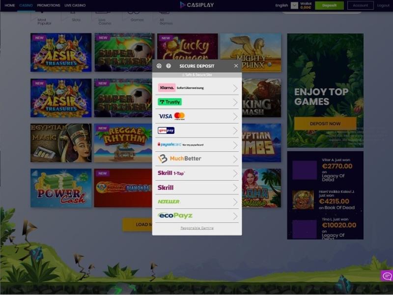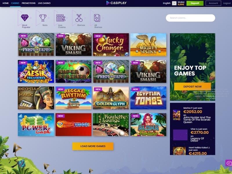 O Casiplay Casino é operado por Amaya, Microgaming, Net Entertainment, BetSoft, 1x2gaming, Big Time Gaming, Evolution Gaming, EYECON, lightningboxgames, Play'n GO, playson, Quickspin, Yggdrasil, Wazdan, Booming Games, Stakelogic, Pragmatic Play, Spinomenal, Red Rake Gaming, Skillzzgaming, SYNOT Games, Skywind, Triple Edge Studios, Northern Lights Gaming, Stormcraft Studios, All41 Studios, Gluck Games, Gameburger Studios, Pulse 8 Studios, Neon Valley Studios, SpinPlay Games, Real Dealer Studios, GONG Gaming, Buck Stakes Entertainment, Games Global, Wizard Games, bluberi, Blueprint Gaming, NeoGames, NextGen, omi-gaming, Pariplay, Inspired Gaming, Gaming Realms, Gamomat, Reel Time Gaming, Authentic Gaming, betiXon, Iron Dog Studio, Old Skool Studios, Foxium, Just For The Win, Reflex Gaming, PearFiction Studios, Wild Streak Gaming, Fortune Factory Studios, RubyPlay, 4ThePlayer, AvatarUX, Gamevy, Crazy Tooth Studio, ReelPlay, Alchemy Gaming, Snowborn Games, Boomerang Studios, Hacksaw Gaming, Bang Bang Games, Slotmill, Peter And Sons, Lucksome Gaming, Area Vegas, Wishbone Games, HammerTime Games, INO Games, Nailed It! Games, Atomic Slot Lab, Neko Games, Reel Kingdom, Oros Gaming and Indigo Magic e os jogos são oferecidos através de uma plataforma online que carrega pelo seu navegador de internet. O site tem um design agradável e também é compatível com dispositivos móveis.