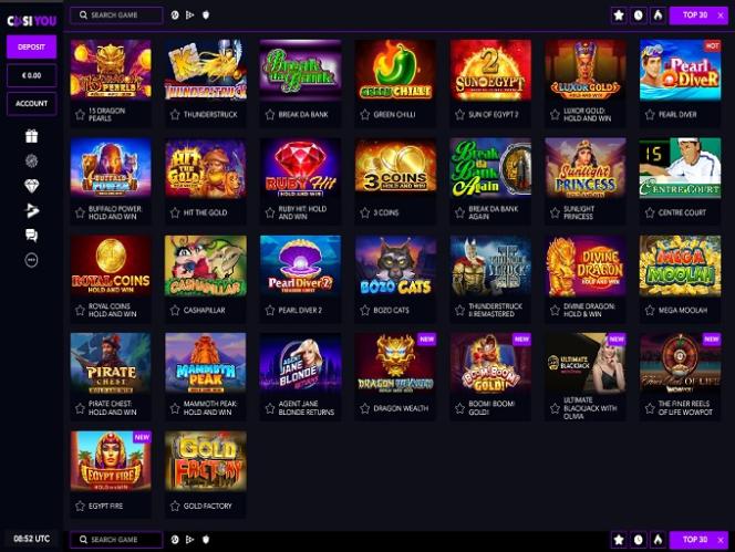Apesar de o CasiYou Casino não oferecer algumas das categorias de jogos de azar online mais populares, ele possui uma rica coleção de jogos de caça-níqueis online, repleta de jogos de alta qualidade de todos os tipos. Aqui estão alguns deles: