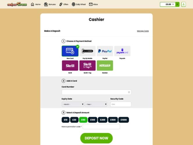 Os jogadores podem usar diversas opções bancárias para depositar e sacar fundos de suas contas, incluindo Visa , Mastercard , Maestro , Skrill , Neteller , Paysafecard e PayPal . Se você estava procurando um cassino online que aceitasse criptomoedas, ficará desapontado, pois o Chilli Spins não aceita nenhuma.