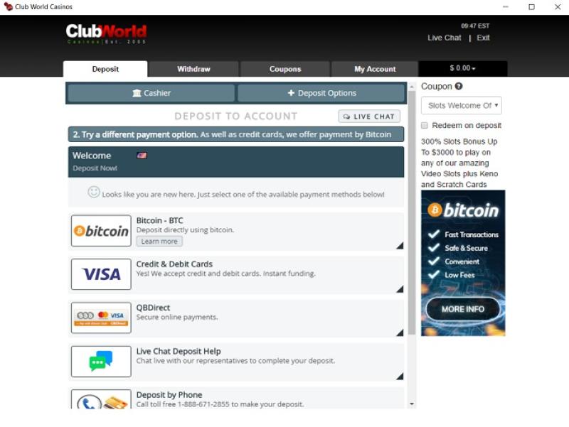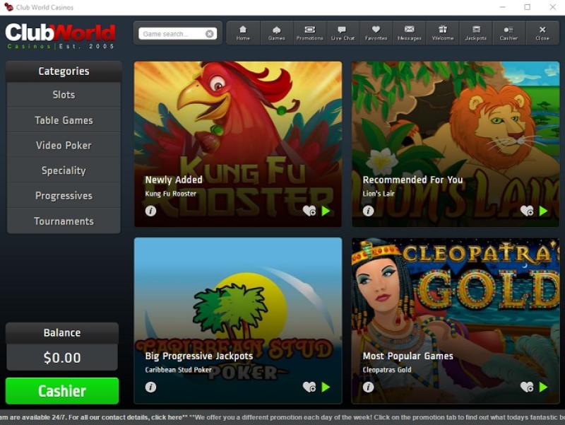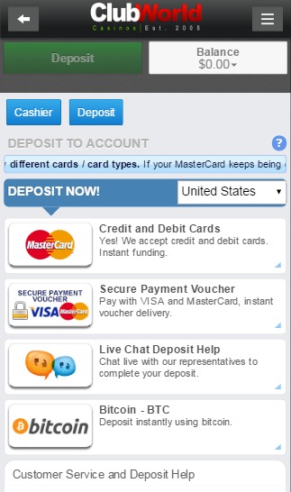 O sistema bancário do Club World Casino é bastante decente para um site voltado para o público americano. Os jogadores podem depositar via cartão de crédito, carteira eletrônica ou transferência bancária, e os saques podem ser processados por meios semelhantes. O Club World Group tem um excelente histórico de pagamentos consistentes, embora os tempos de processamento não sejam os mais rápidos, dadas as restrições impostas às transações de jogos de azar nos EUA. Mesmo assim, o sistema aqui está entre os melhores que já vimos para um cassino que atende ao mercado americano.