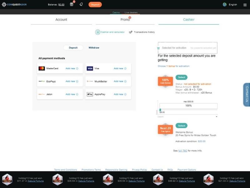 O cassino Conquestador oferece os métodos de pagamento mais populares : todos os tipos de cartões de pagamento, opções de pagamento móvel e carteiras eletrônicas.