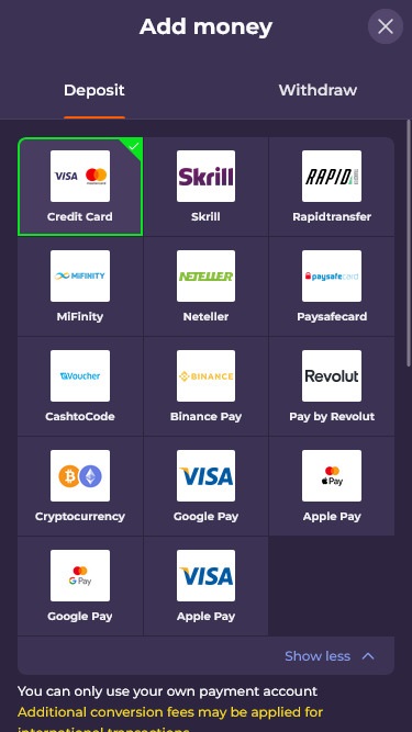 🤑 Limite de saque€1,000 Daily/€3,000 Weekly/€10,000 Monthly (All withdrawals that exceed €15,000 will be divided into monthly installments.)