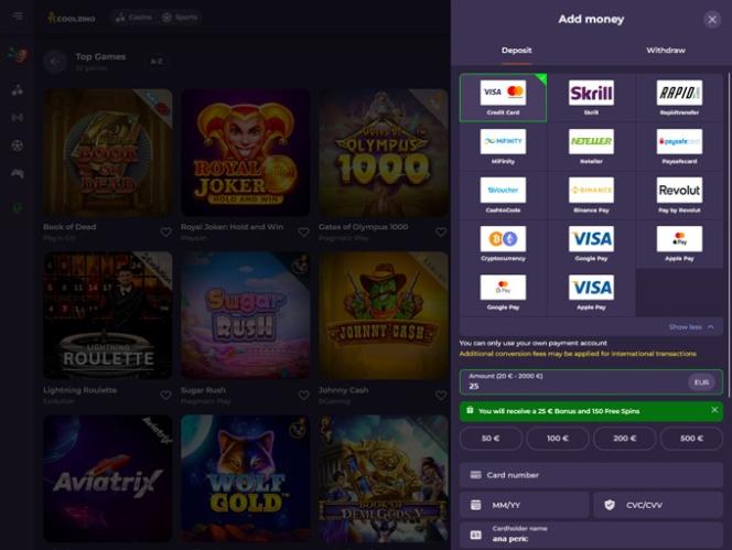 Quem aprecia cassinos online com diversas opções de jogos de azar vai se divertir muito no Coolzino Casino. A marca oferece caça-níqueis online, jogos de mesa, jogos de cassino ao vivo e raspadinhas . Há uma grande variedade de opções, e acreditamos que até os jogadores mais experientes encontrarão algo novo.