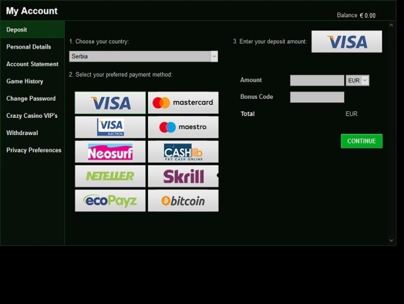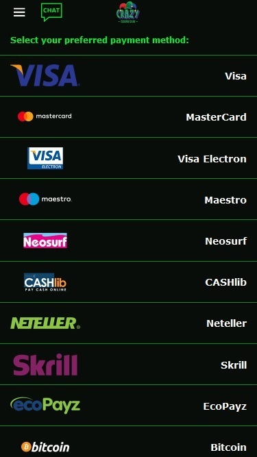 Analisando os termos e condições, não encontramos nada que se destaque como injusto ou predatório para os jogadores. O sistema bancário do Crazy Casino é bom, com o site aceitando depósitos e saques via Visa, Neteller, MasterCard, Skrill, Electron e Maestro. Depósitos também podem ser feitos por ecoPayz, Paysafecard, Giropay e SOFORT, enquanto saques podem ser processados por transferência bancária. Os pagamentos podem ser processados em até 24 horas para carteiras eletrônicas, enquanto transferências bancárias levam 5 dias e pagamentos com cartão de crédito e débito podem levar até 10 dias úteis. Há um limite de saque de £ 5.000 por mês para ganhos.