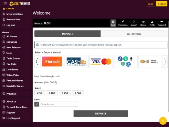 O depósito mínimo é de 25 dólares e o saque mínimo é de 100 dólares! Os requisitos de aposta são muito altos (x70). Sempre tentei não jogar nesses cassinos, mas tentei. Infelizmente, não conhecia essa regra e não consegui sacar meus ganhos de 80 dólares. E perdi tudo. É triste.)