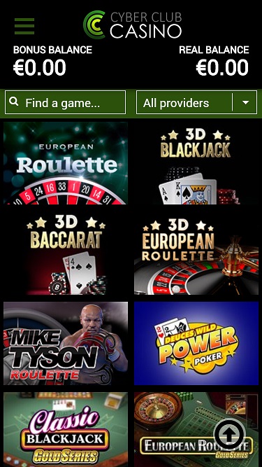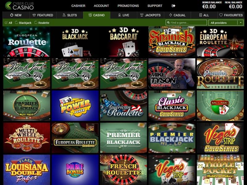 O Cyber Club Casino é alimentado por Net Entertainment, BetSoft, Barcrest, ELK Studios, Ezugi, lightningboxgames, Play'n GO, Quickspin, Thunderkick, Realistic Games, Bulletproof Games, Aristocrat, Blueprint Gaming, Leander Games, NextGen, Inspired Gaming, White Hat Gaming, SG Interactive, Betdigital, Bla Bla Bla Studios and MetaGU e seus jogos de cassino são fornecidos por meio de uma plataforma baseada na web, bem como por meio de um site móvel.