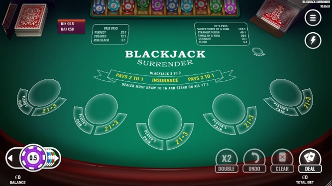 | Blackjack Surrender | Ficar | Não | Quaisquer 2 | 1 | Não | - | - | Sim | 99.65% | 6 | Não |