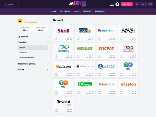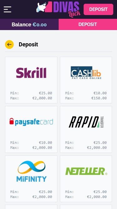 No Divas Luck Casino, os jogadores podem escolher entre diversas opções de pagamento confiáveis, como carteiras eletrônicas, transferências bancárias, cartões de débito e crédito, criptomoedas e criptocarteiras . Observe que os métodos bancários disponíveis para depósitos e saques variam de acordo com o país, portanto, verifique primeiro se o método de transação escolhido está disponível em sua jurisdição.