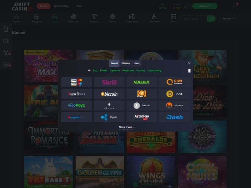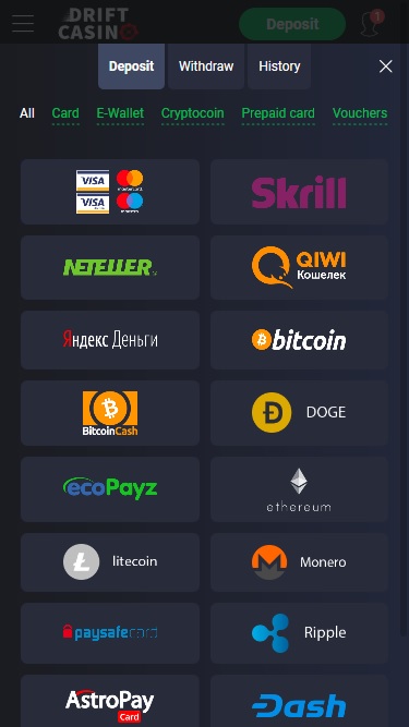 O sistema de pagamentos do Drift Casino é decente, já que o site aceita depósitos e saques via Visa, MasterCard, Maestro, Moneta.ru, Interkassa, Yandex, Liqpay, Skrill, Neteller, Paysafecard e transferência bancária. Os tempos de pagamento são um pouco mais lentos do que o esperado, mas também não são excessivamente demorados. O cassino opera no mercado de apostas russo, o que pode explicar algumas das limitações observadas.