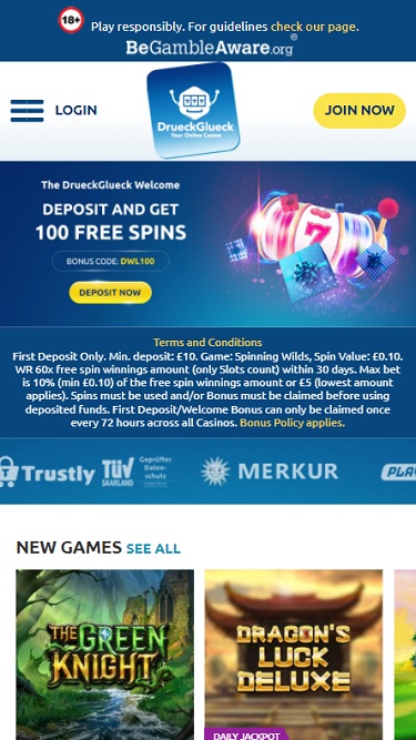 O DrueckGlueck Casino é um site de apostas online que atende ao mercado alemão, sendo um dos primeiros sites licenciados a operar no estado de Schleswig-Holstein. O cassino foi lançado em 2015 e é propriedade da Cognita Technologies Ltd, que também o opera. Inaugurado em 2015, o site oferece uma vasta biblioteca de jogos, o que lhe confere grande potencial de atrair visitantes.
