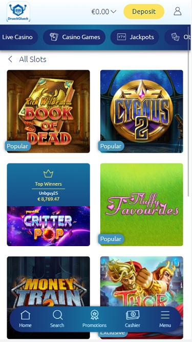 Existem centenas de slots disponíveis para jogar no Cassino DrueckGlueck, sendo os caça-níqueis de vídeo a maioria dos jogos oferecidos. O cassino também possui slots para dispositivos móveis, bem como jackpots progressivos, que dão aos jogadores a chance de ganhar milhões em prêmios com uma única rodada.