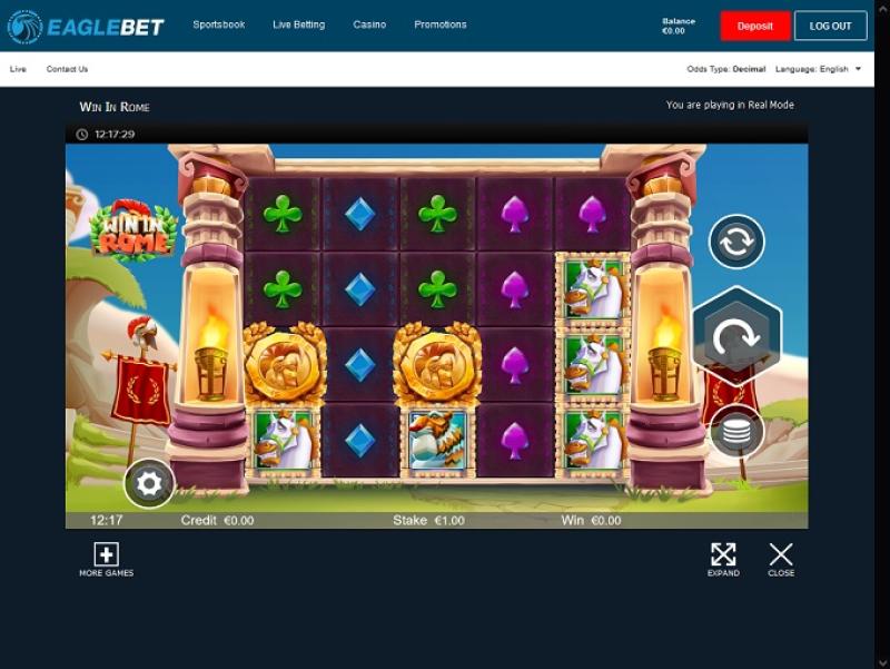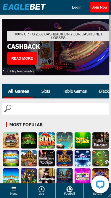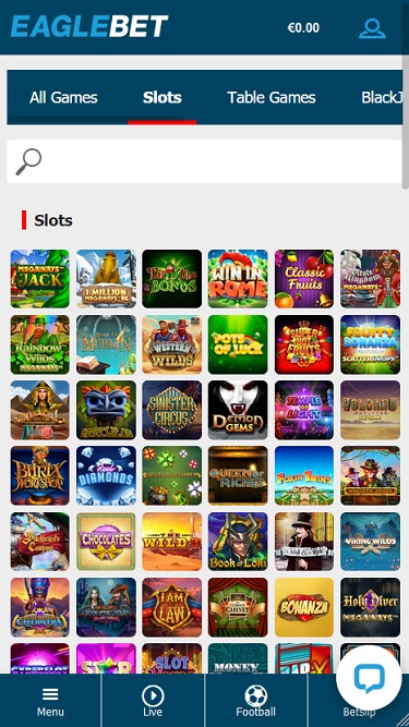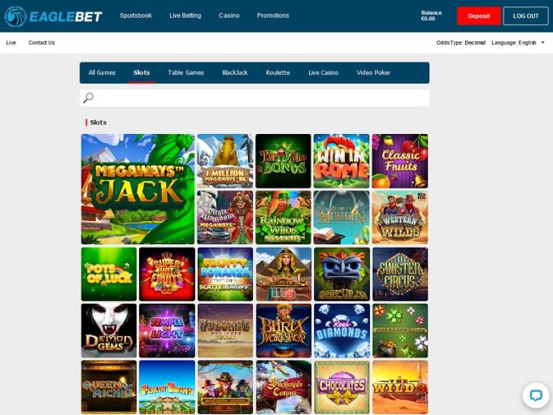 O EagleBet Casino é alimentado por Microgaming, Big Time Gaming, Evolution Gaming, Play'n GO, Quickspin, All41 Studios, Gameburger Studios, Games Global, Blueprint Gaming, Tom Horn Gaming, Just For The Win, Crazy Tooth Studio and Alchemy Gaming e os jogos do site são oferecidos através de uma plataforma online acessível diretamente pelo seu navegador de internet. O design do site é agradável e fácil de navegar. Fica especialmente bonito no seu smartphone, já que o jogo em dispositivos móveis é totalmente compatível.