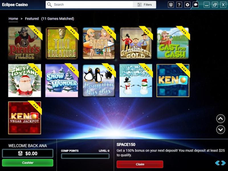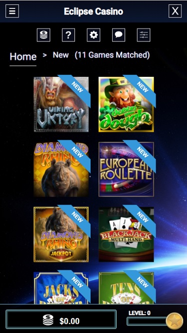 O Eclipse Casino oferece uma boa variedade de slots de vídeo e clássicos, incluindo todo o catálogo da Rival. O cassino também disponibiliza alguns jackpots progressivos e oferece suporte para slots em dispositivos móveis, permitindo que você jogue em qualquer lugar. A qualidade dos slots oferecidos varia de muito boa a ruim, com os jogos mais antigos mostrando sinais de desgaste quando comparados a jogos de outros desenvolvedores como Microgaming, NetEnt, Playtech, RTG, etc.