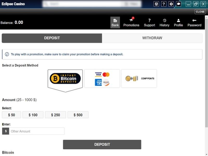 O sistema bancário do Eclipse Casino não é dos melhores, já que o cassino tem limites de saque baixos, de apenas US$ 2.000 por semana, e os pagamentos levam de 7 a 10 dias úteis para serem concluídos. Considerando que o site atende ao mercado de apostas americano, é compreensível a existência dessas restrições. Depósitos e saques são processados por meio de MasterCard, Visa, Skrill, Neteller, Paysafecard e transferência bancária.