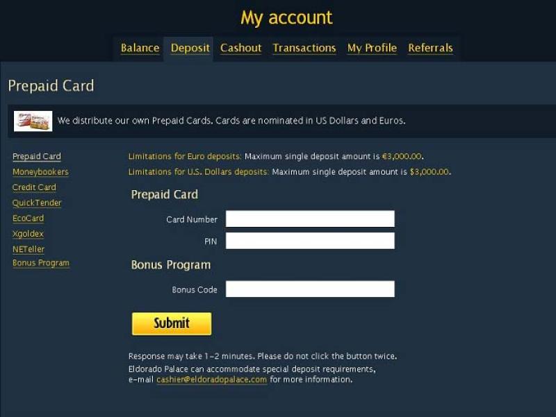 O El Dorado Palace é um site de apostas online fundado em 2009. Sediado na Costa Rica, o site ganhou má reputação ao longo de sua trajetória online devido a pagamentos lentos, não pagamento de ganhos e suporte ao cliente ineficiente. Por isso, recomendamos fortemente que você evite este cassino.Informações do cassino