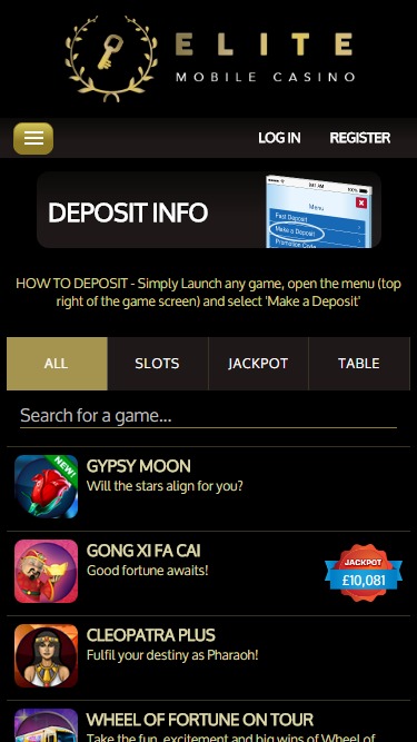 O Elite Mobile Casino oferece uma grande variedade de slots para jogar, incluindo dezenas de caça-níqueis de vídeo e alguns títulos clássicos de 3 cilindros. Todos os jogos são otimizados para telas menores e têm ótima aparência e jogabilidade mesmo em espaços reduzidos.
