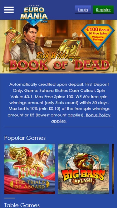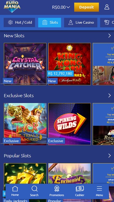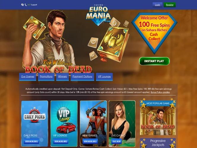 Existem centenas de slots disponíveis no EuroMania, com o site oferecendo uma ampla variedade de slots clássicos e de vídeo de alguns dos melhores desenvolvedores do mundo. Há também milhões de dólares em jackpots progressivos disponíveis para serem ganhos, com grandes prêmios como o Mega Moolah, Major Millions e outros.